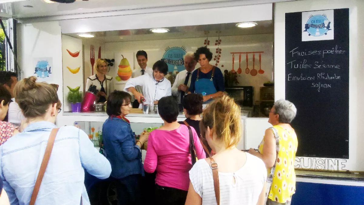 La recette du jour, cuisinée dans le food truck : Fraises poêlées, Tuiles Sésame & Emulsion Rhubarbe Safran. Vous salivez déjà ? Vous n'avez encore rien vu ! Sophie et Nadine nous emmènent à la rencontre des producteurs locaux sans qui ses recettes n'aurait probablement pas la même saveur...