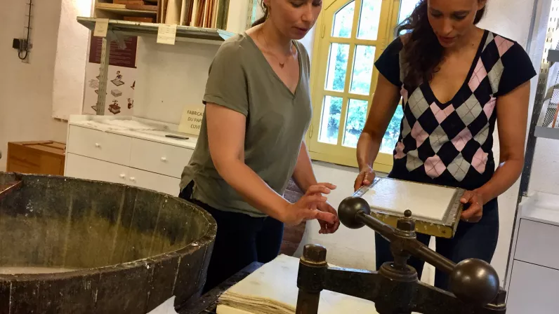 Enfin, Nathalie nous emmène à Gorges à la rencontre d’Anne Leroy-Ruiz et de Morgane Allain, deux passionnées qui chaque jour œuvrent pour faire revivre l’âme du Moulin à papier du Liveau. Situé sur la Sèvre Nantaise, non loin du musée de l’imprimerie à Nantes, le moulin est un produit de l’Histoire, reconstruit sur le modèle italien de la ville de Clisson, suite à la guerre de Vendée. Dernier témoin de l'activité papetière de la région, ce moulin à papier, réhabilité et remis en activité avec sa roue à aubes, est un atelier vivant qui permet de fabriquer sa feuille de papier et de s’initier à l’impression.