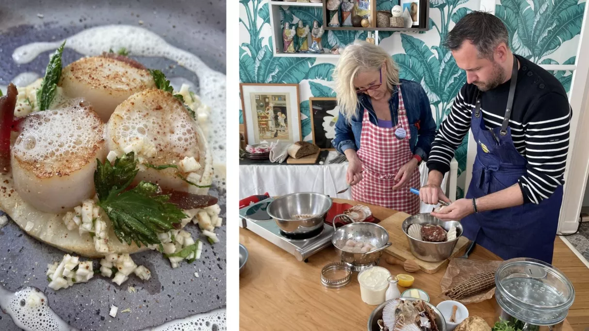 Une fois le marché terminé, David et Isabelle enfileront leur tablier pour une recette concoctée à quatre mains : une assiette terre et mer de Saint-Jacques.