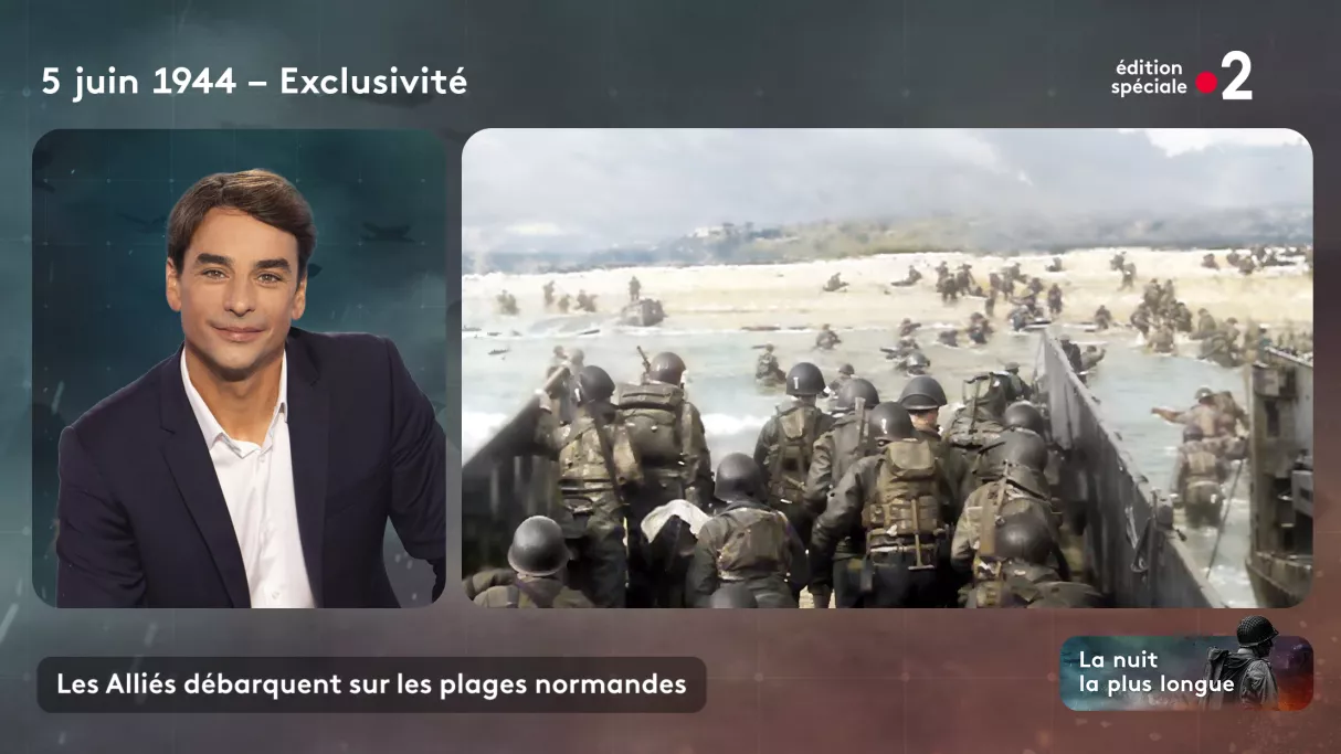 Exercice inédit pour retracer La nuit la plus longue, celle du 5 juin 1944, comme si nous y étions. Une émission de 75 minutes, à vocation pédagogique, pour raconter l’Histoire avec les informations dont on disposait à l’époque. Dans le plus strict respect historique. Et avec des images restaurées grâce à intelligence artificielle et recolorisées.