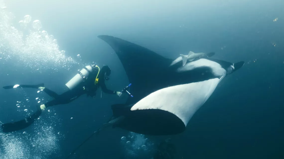 Mille cinq cents kilomètres plus au nord, en Équateur, la richesse du courant de Humboldt donne naissance à une profusion exceptionnelle de vie marine dans le sanctuaire des îles Galápagos. Et c’est au large de Guayaquil, non loin de la Isla de la Plata, aussi appelée les petites Galapagos, que nous allons à la rencontre du biologiste marin Michel Guerrero. Il s’est, depuis des années, passionné pour la vie des raies mantas géantes, l’un des animaux les plus gracieux et majestueux de nos océans, aujourd’hui menacé d’extinction.