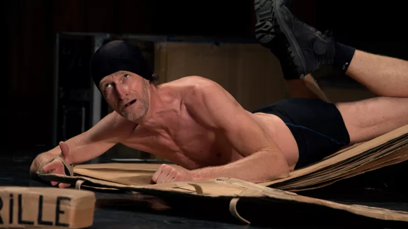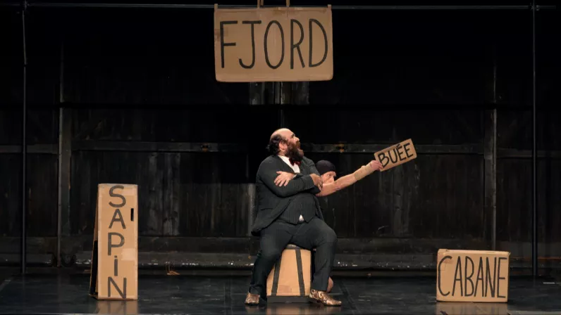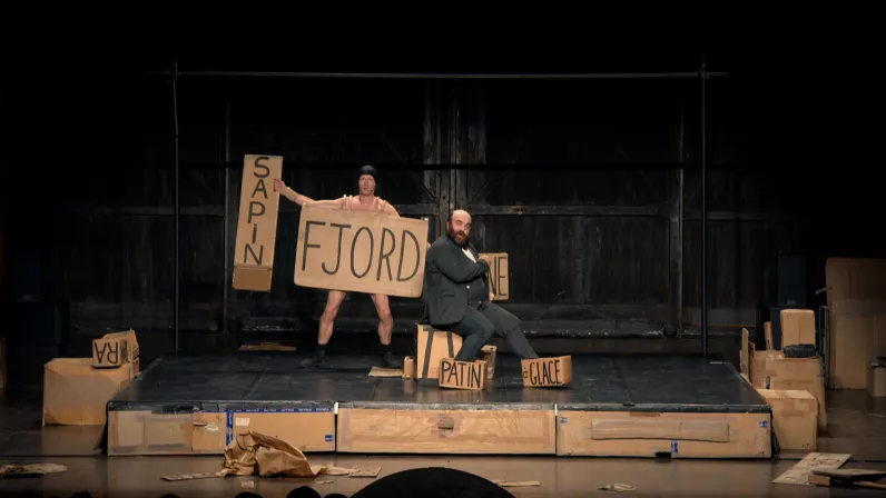 Il quitte les plaines du Grand Nord, maudit par une sirène pêchée par accident. Il s’évade en patins, à trottinette, en avion cartonné. Il découvre l’Écosse, repart vers le sud à dos de mulet, assassine quelques cornemuseurs au passage, cherche l’amour, toujours. Mais l’acteur en costume trois pièces reste assis, c’est la folie du spectacle. Son acolyte en maillot de bain s’agite autour de lui avec des centaines de morceaux de carton où sont inscrits les noms des pays, accessoires ou bestioles rencontrées. Aventures rocambolesques déployées à force d’astuces et de gags, c’est une explosion d’idées géniales et farfelues.