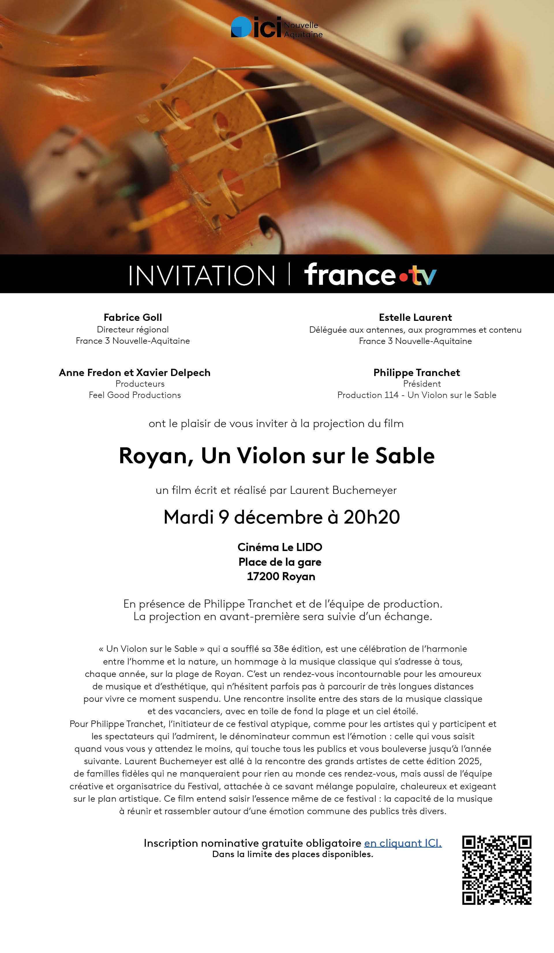 Nous avons le plaisir de vous convier à l'avant-première du documentaire "Royan, Un Violon sur le Sable".
