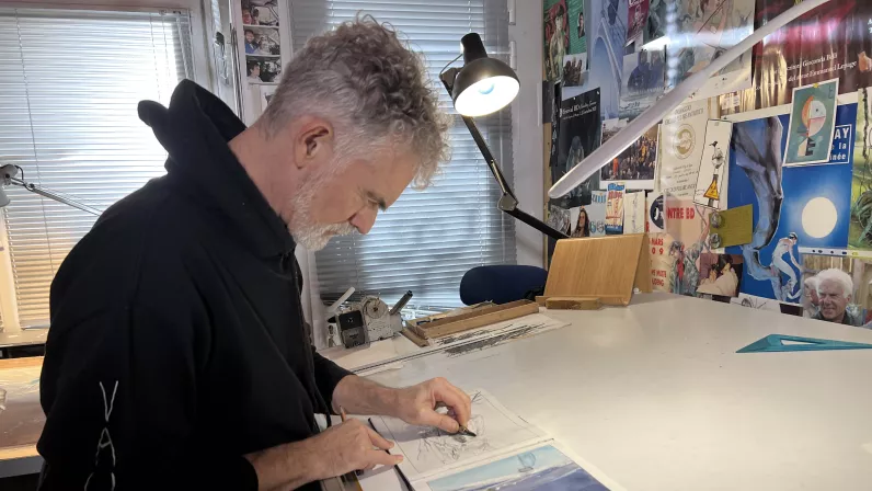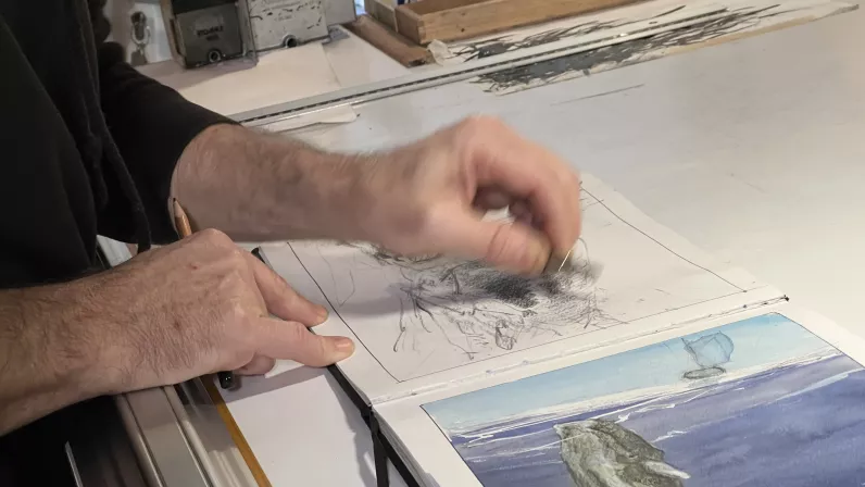 Du phare d’Ar Men aux Terres Australes, il partage sa vie entre le voyage, le dessin et ses racines bretonnes où tout a commencé. Il vient de publier Danser avec le Vent, un retour aux Kerguelen 12 ans après son premier voyage.