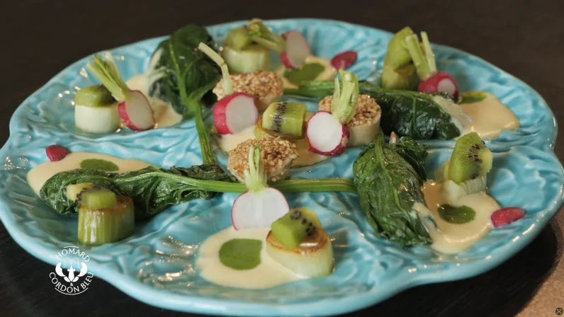 Au menu : poireaux et kiwi pour une alliance pleine de peps, ballotins d’épinards farcis aux huîtres chaudes, pleurotes et échalotes fondants accompagnés d’un sabayon à l’eau de mer et d’une huile de fanes de radis.