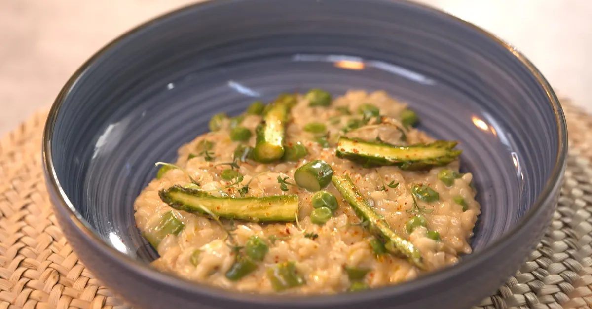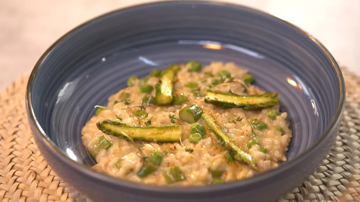 Florian nous prépare un risotto aux asperges et chaource.