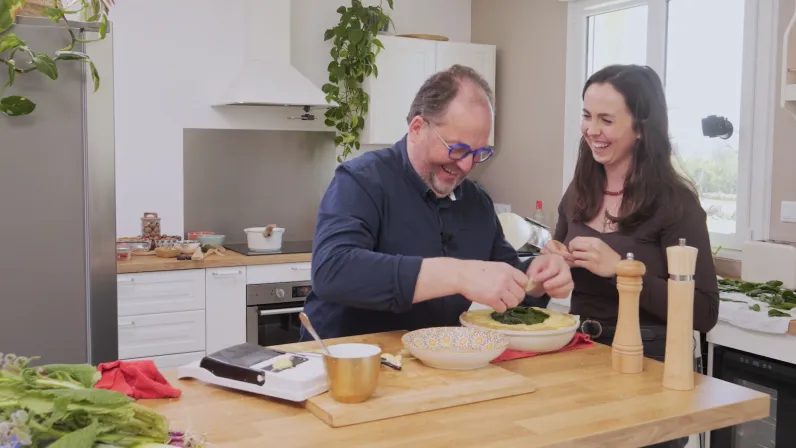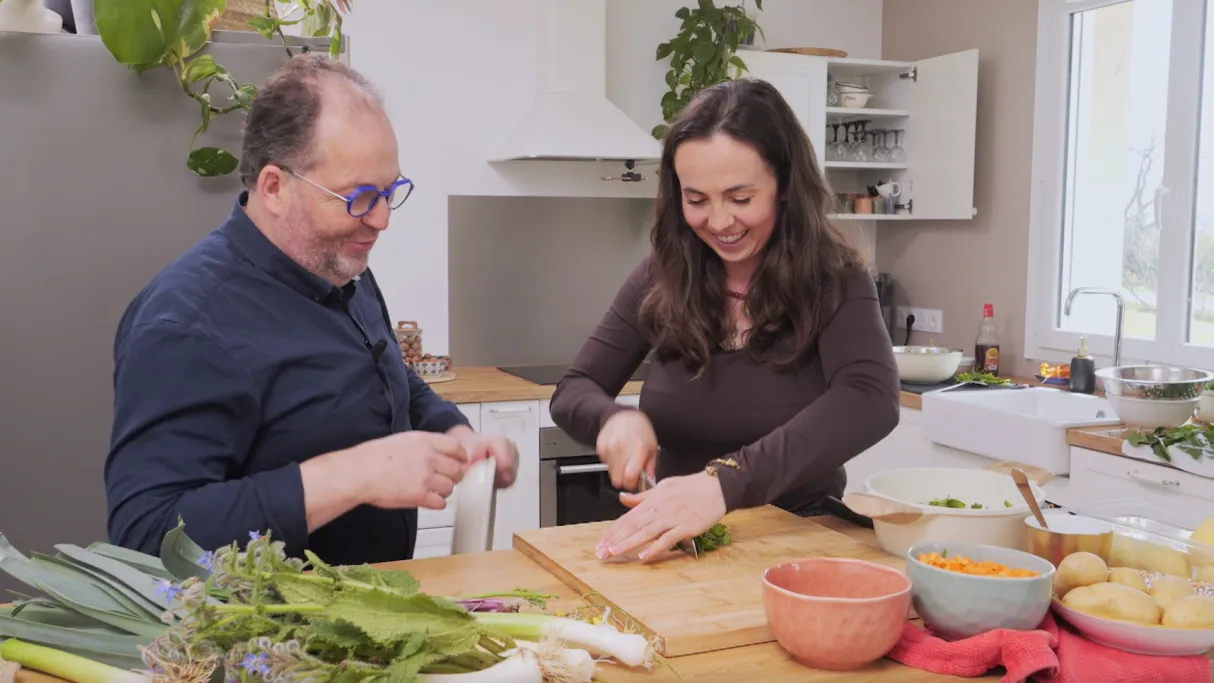 Pour accompagner ce défi, ils prennent la direction de la ferme maraîchère de Nico, « Pied à Terre ». Un lieu foisonnant où se côtoient épinards, poireaux, persil et bourrache, et dans lequel le chef est comme un poisson dans l’eau. De retour en cuisine, la recette se dessine.